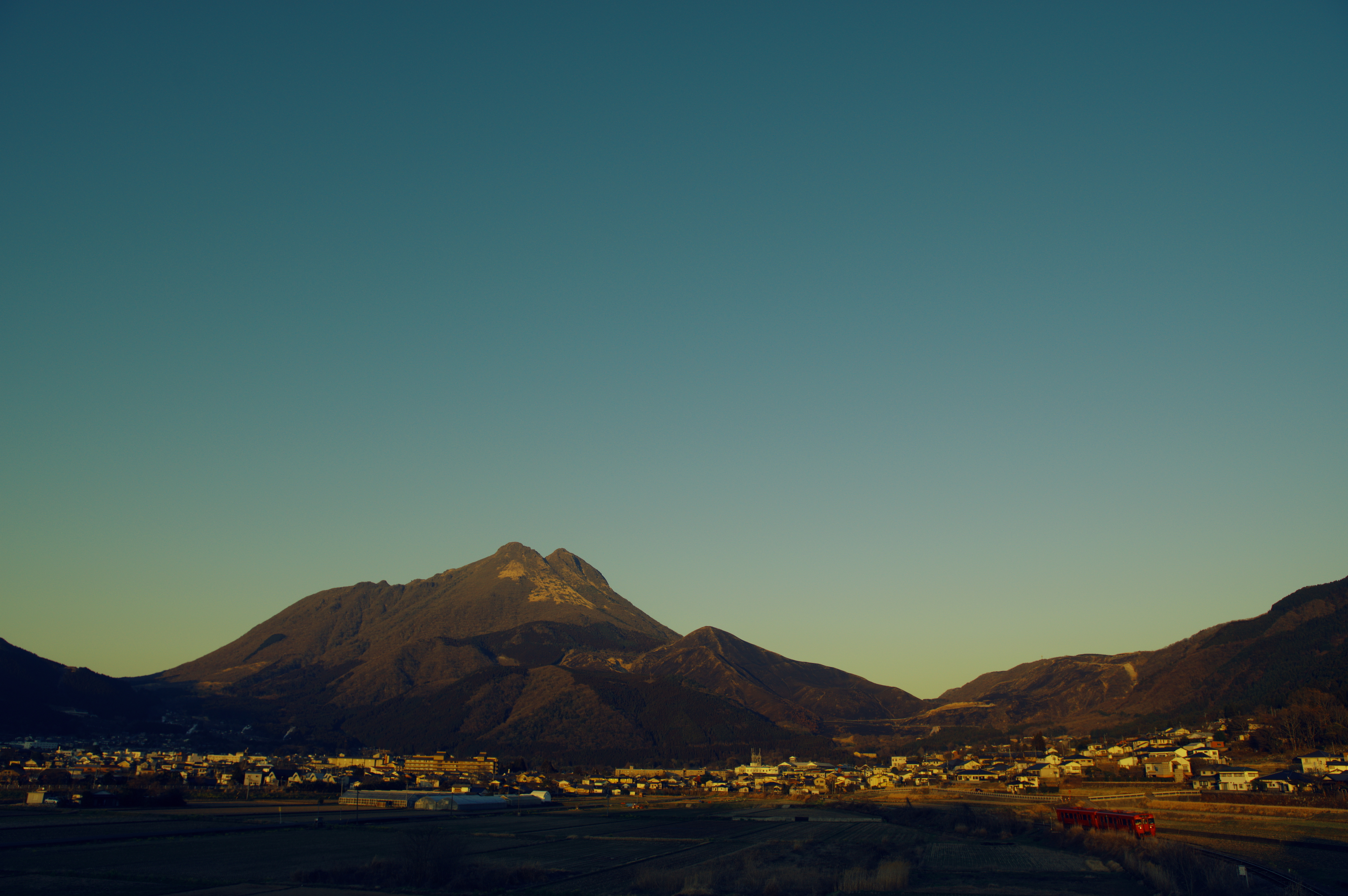 2024-03-18 20310_暮れゆく盆地 好きです大分県 日常 鉄道 PENTAX KP + HD PENTAX-DA★16-50mmF2.8ED PLM AWF5.6 1/250 ISO-100 久大本線に出かけた日、最後のカット。 この日はとてもよく晴れていて、由布岳はてっぺんまで美しく見えていた。ここを走る列車のカットを1枚撮っておきたかったので、帰りがけに寄り道をした。 由布院盆地日暮れが迫る中、真っ赤な2両編成の普通列車が、大分に向けて軽やかに駆けて行った。 ランキング参加中鉄道